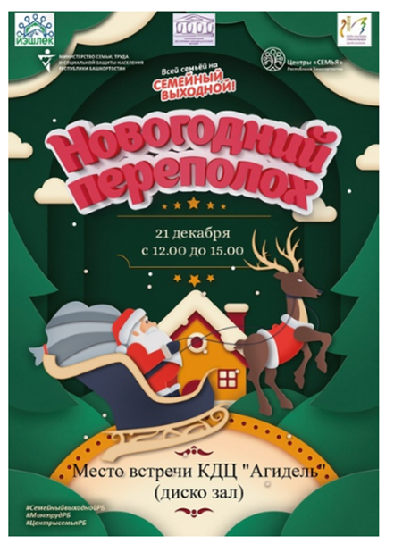 21 декабря с 12:00 ч. до 15:00 ч. на площадке КДЦ Агидель (диско-зал — 2 этаж) ГБУ Южный МР Центр «Семья» проведет мероприятие «Семейный выходной».Тематика мероприятия - "Новогодний переполох".
