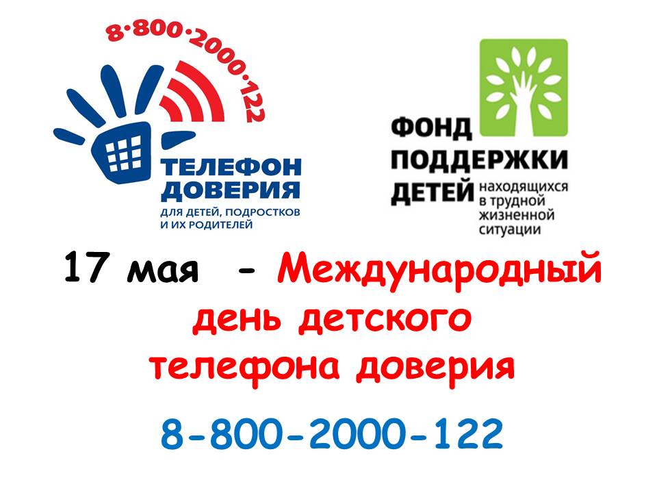 17 мая - Международный день детского телефона доверия Ежегодно 17 мая во всем мире отмечается Международный день детского телефона доверия. Это день, когда внимание широкой общественности привлечено к необходимости усиления мер по защите детей, находящихся в трудной жизненной ситуации, и помощи им.